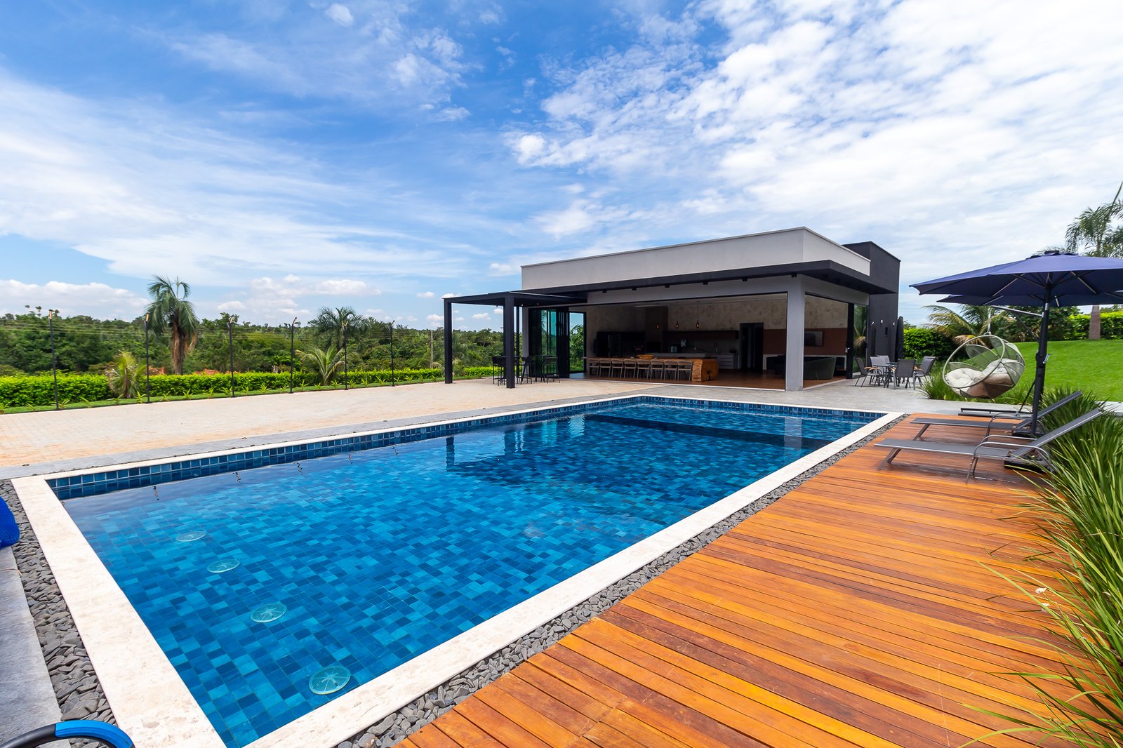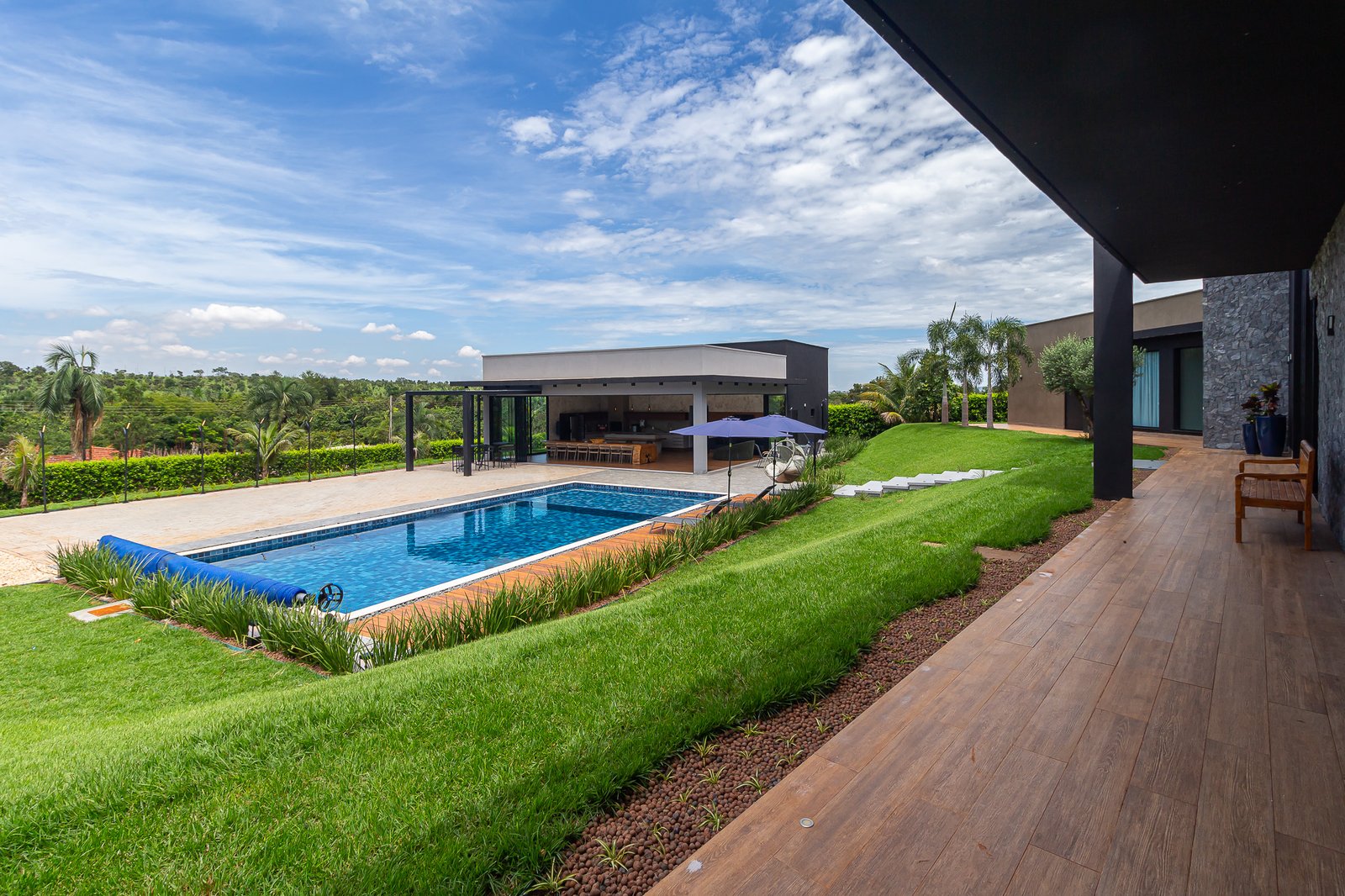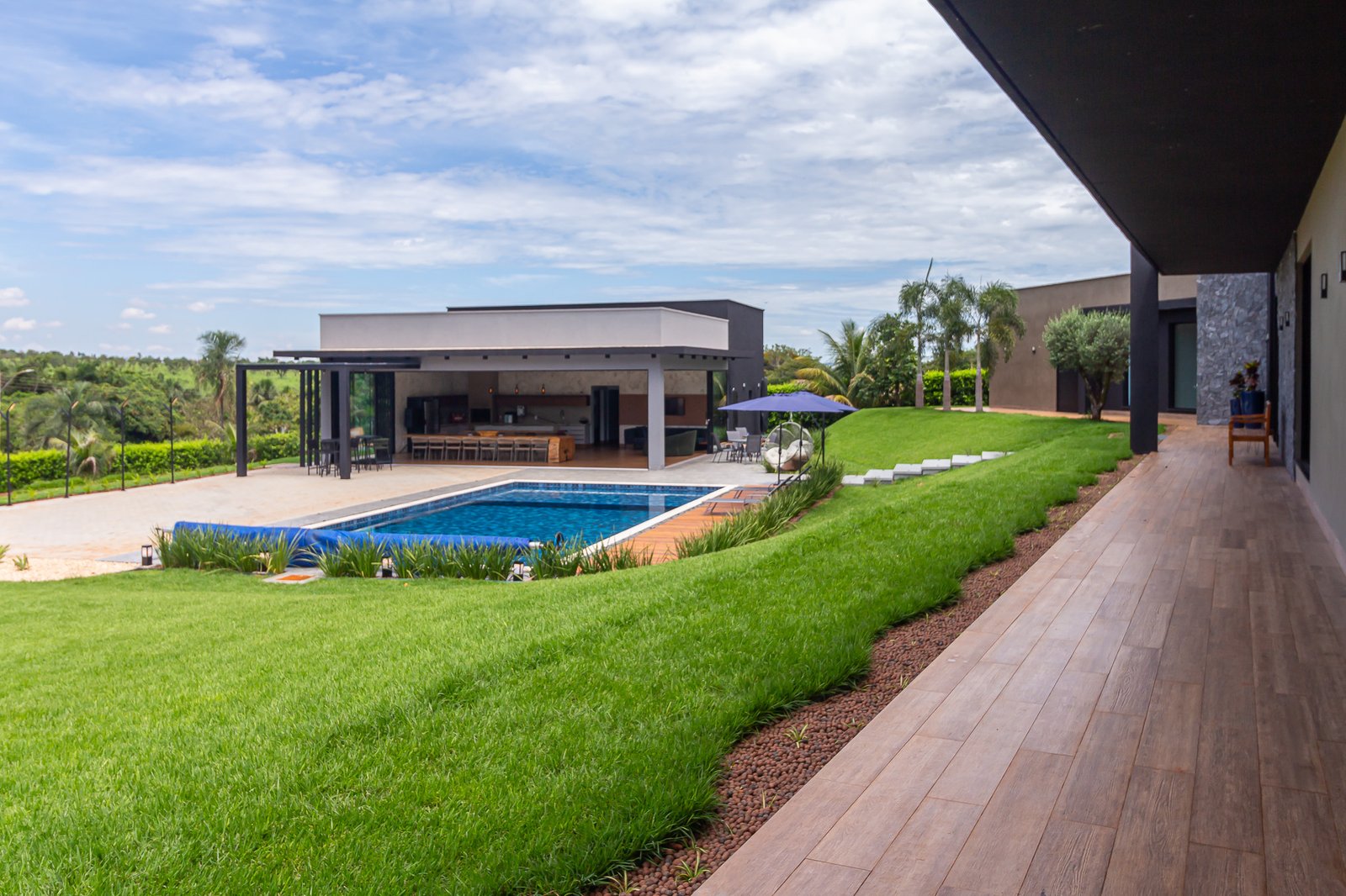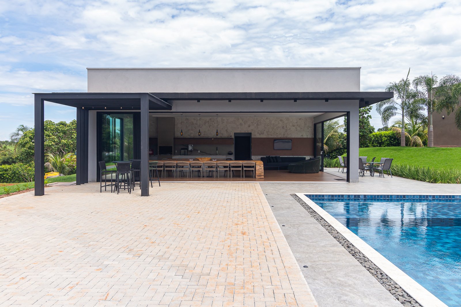 Uma característica marcante deste projeto foi atender ao estilo de vida dos proprietários, que prezam por receber bem. Para isso, criamos uma ampla e elegante área gourmet, equipada com uma piscina aquecida e um salão projetado para o máximo conforto. Toda a infraestrutura foi planejada para oferecer uma experiência única aos convidados, unindo sofisticação e acolhimento em cada detalhe.