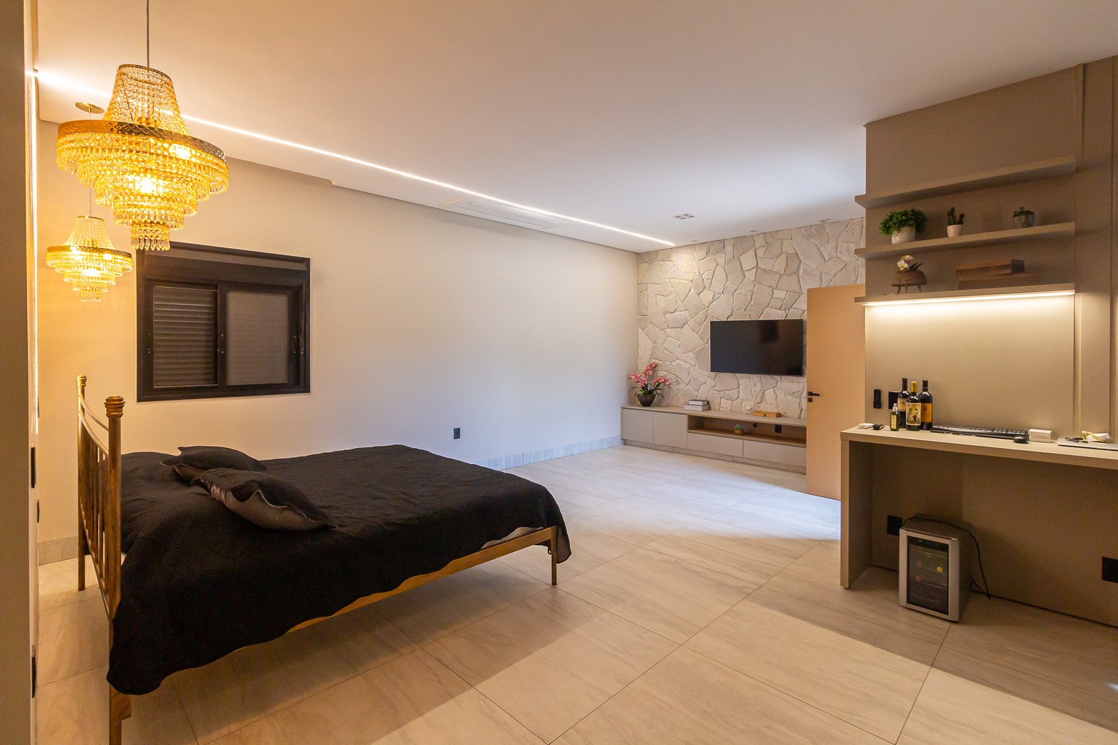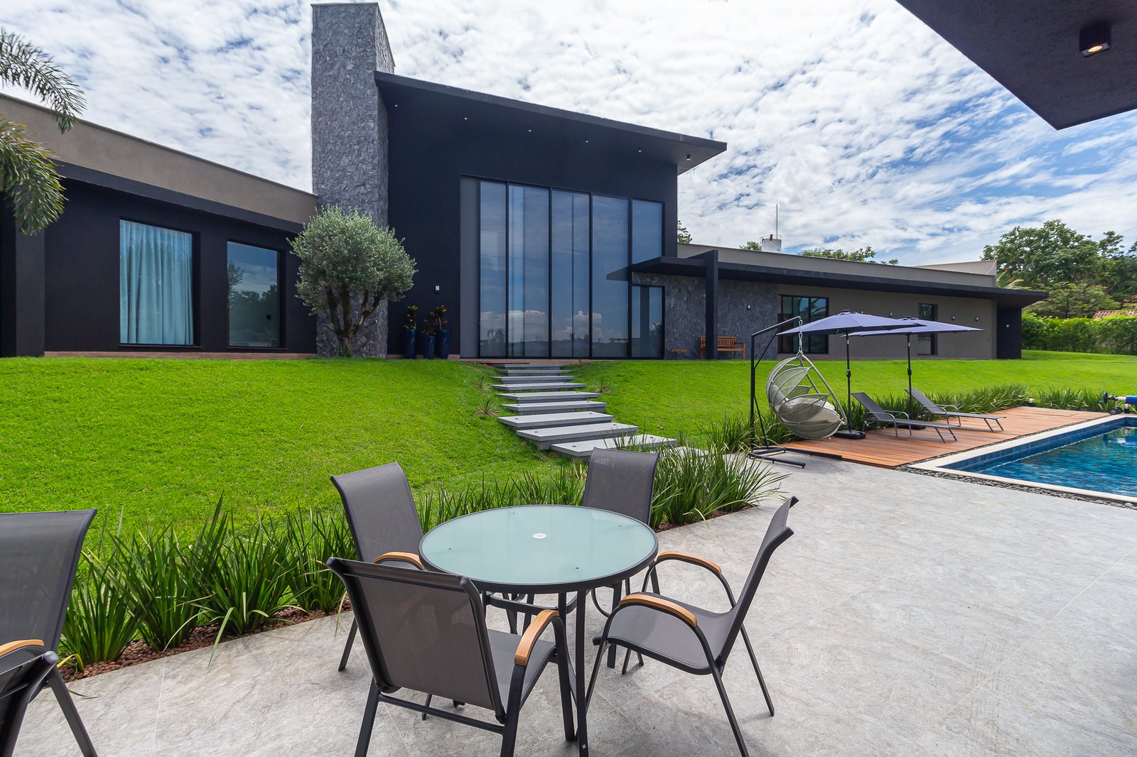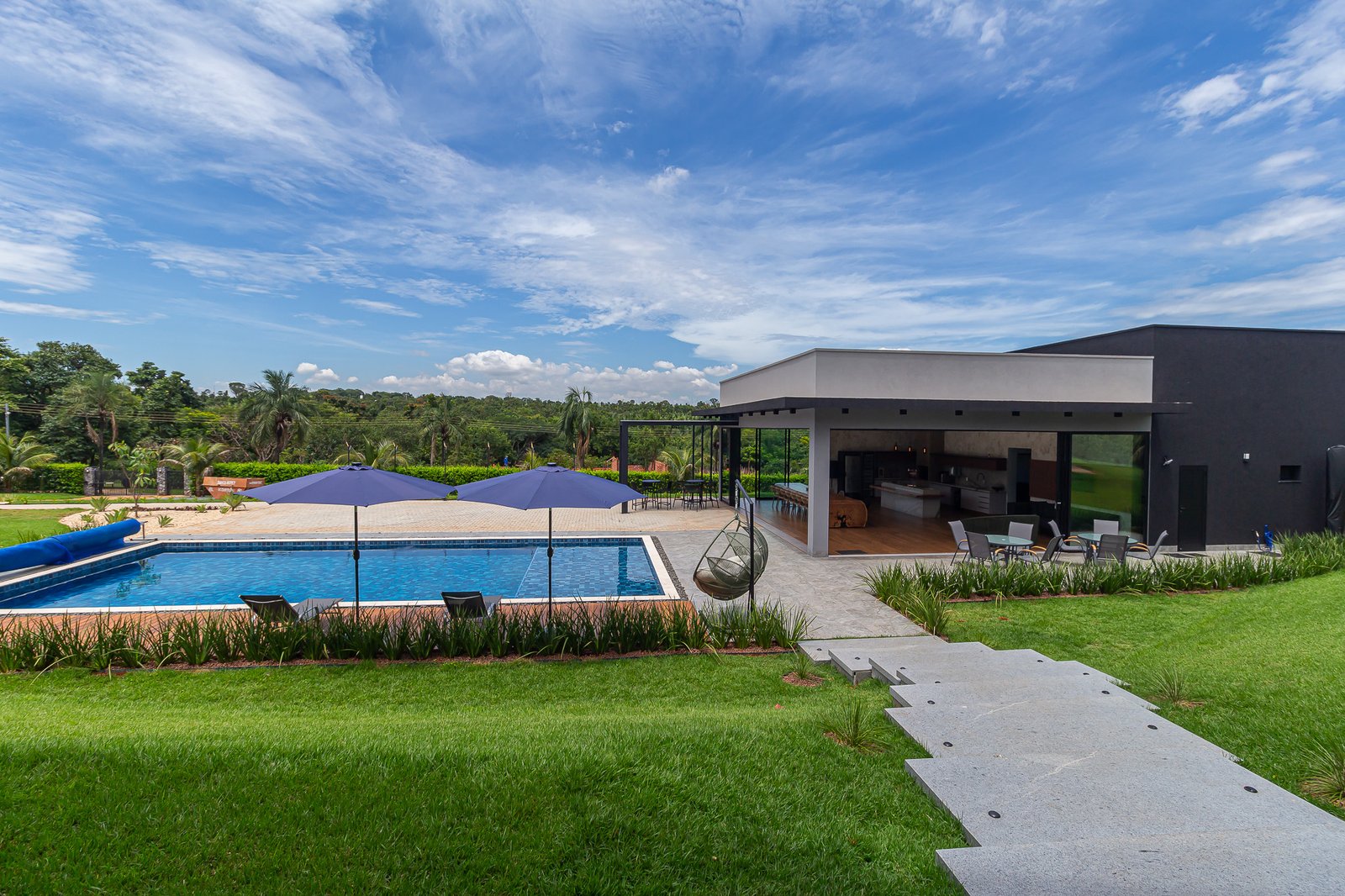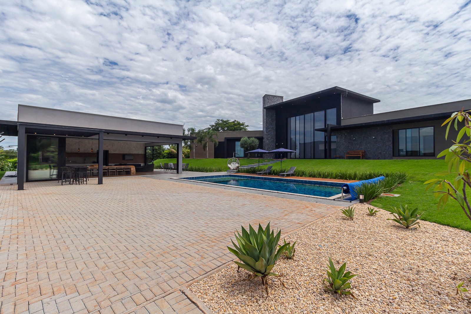 Uma característica marcante deste projeto foi atender ao estilo de vida dos proprietários, que prezam por receber bem. Para isso, criamos uma ampla e elegante área gourmet, equipada com uma piscina aquecida e um salão projetado para o máximo conforto. Toda a infraestrutura foi planejada para oferecer uma experiência única aos convidados, unindo sofisticação e acolhimento em cada detalhe.