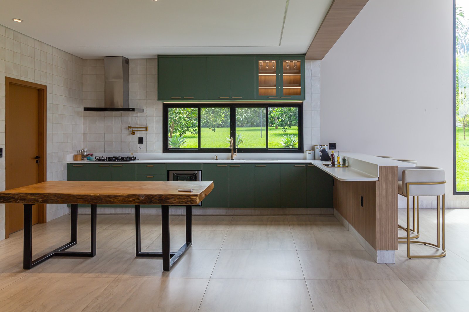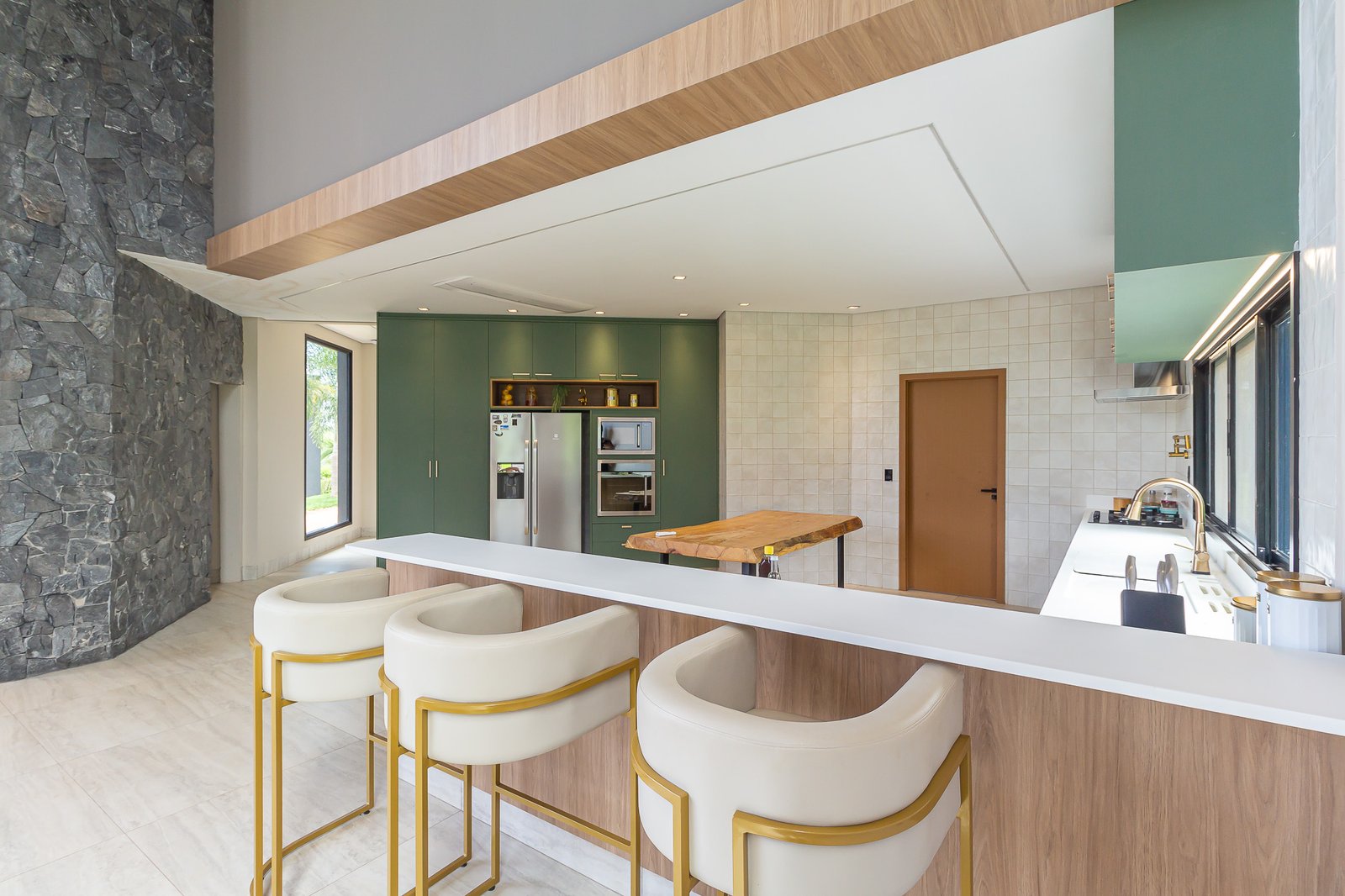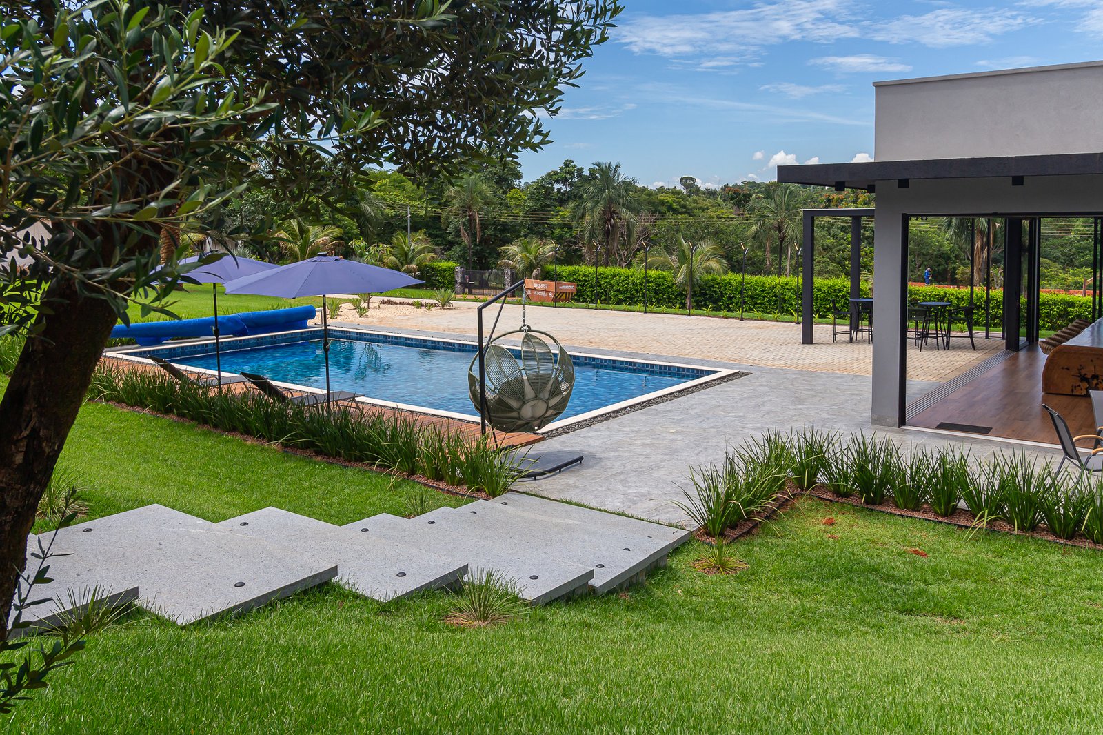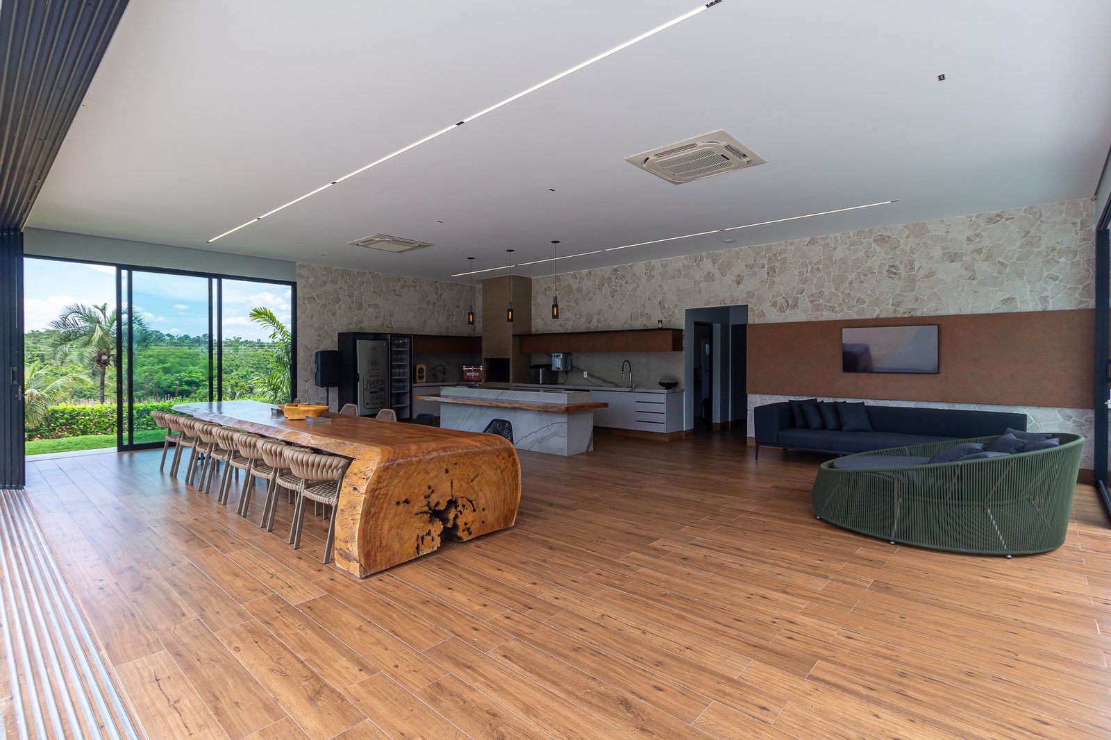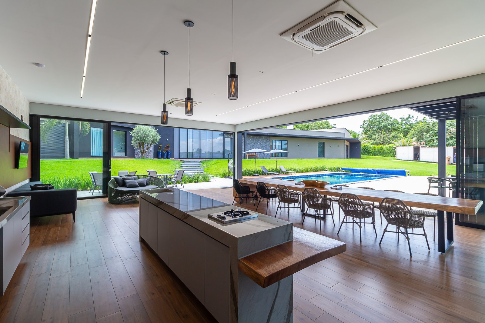 Uma característica marcante deste projeto foi atender ao estilo de vida dos proprietários, que prezam por receber bem. Para isso, criamos uma ampla e elegante área gourmet, equipada com uma piscina aquecida e um salão projetado para o máximo conforto. Toda a infraestrutura foi planejada para oferecer uma experiência única aos convidados, unindo sofisticação e acolhimento em cada detalhe.