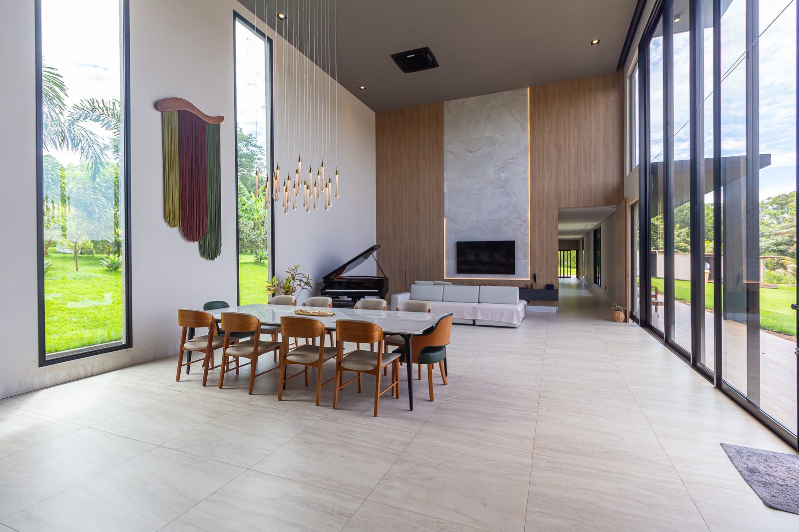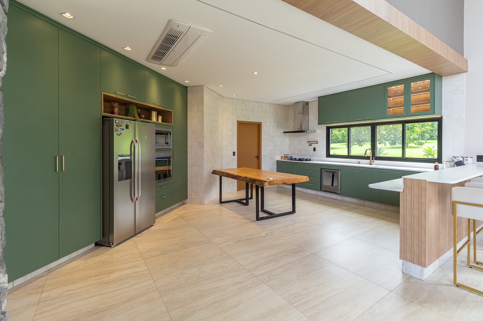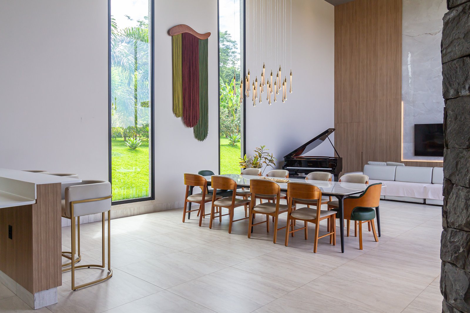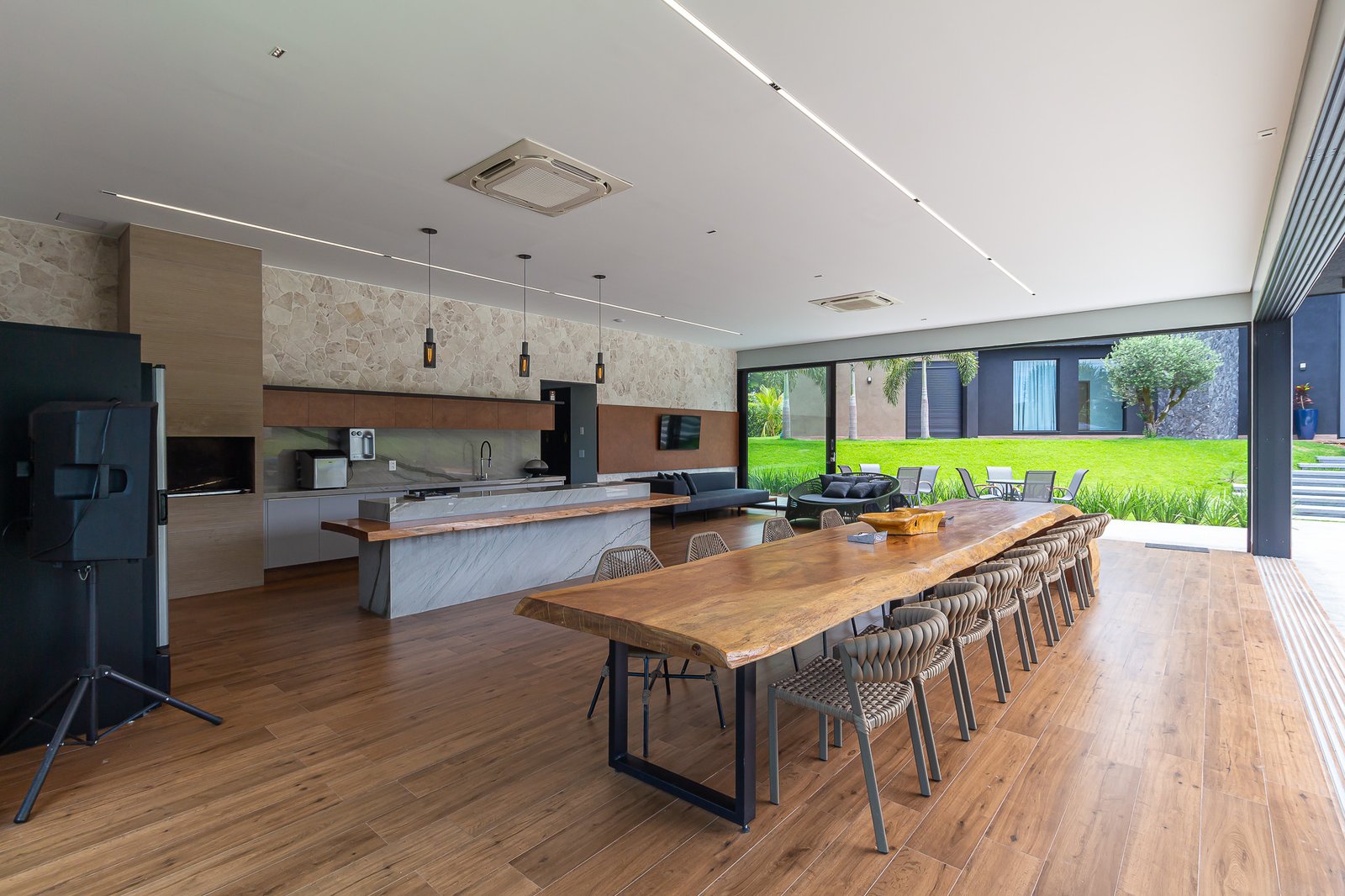 Uma característica marcante deste projeto foi atender ao estilo de vida dos proprietários, que prezam por receber bem. Para isso, criamos uma ampla e elegante área gourmet, equipada com uma piscina aquecida e um salão projetado para o máximo conforto. Toda a infraestrutura foi planejada para oferecer uma experiência única aos convidados, unindo sofisticação e acolhimento em cada detalhe.